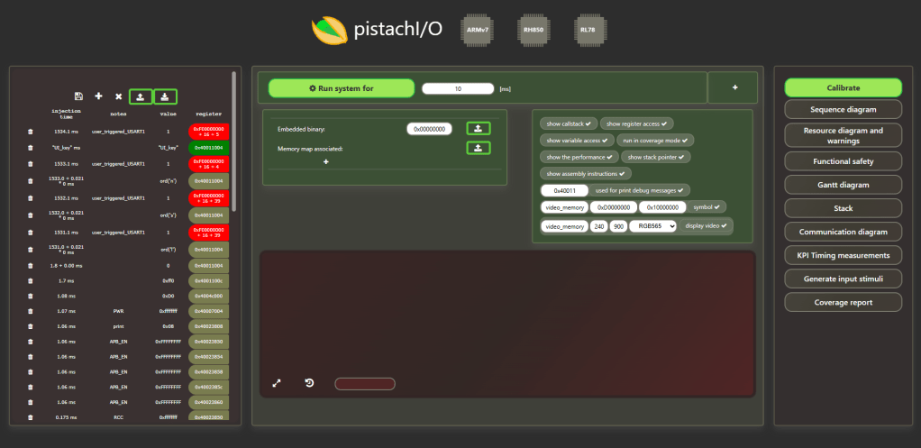 Description Run an embedded SW directly from the binary file, and generate diagrams, measure times, detect errors / warnings, show functional decomposition and flow, in your SW. Currently support for running on architectures ARMv7, RH850, RL78 PistachI/O running now: